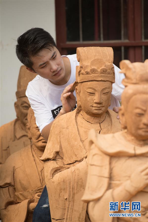 8月6日,许明笙在查看晾制中的泥塑。新华社记者翁忻旸摄