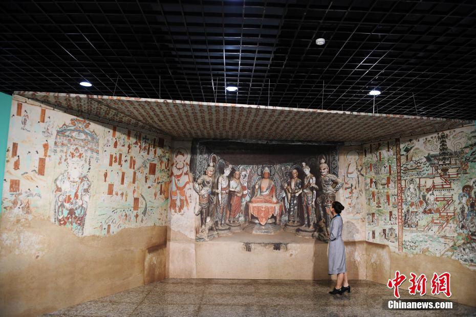 8月6日,高保真复制的莫高窟第45窟“彩塑一铺”亮相敦煌。近日,“丝路美地·敦煌”展在甘肃敦煌国际会展中心展出,展览展出了大幅高保真复制壁画、3D打印彩塑、复制洞窟等,此次展览通过数字化、多元立体展示,让民众“零距离”体验敦煌艺术之美。 中新社记者 杨艳敏 摄