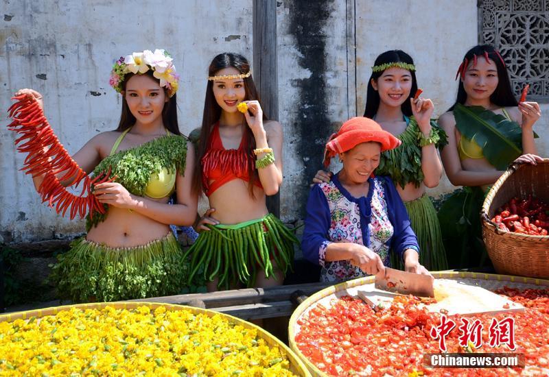 8月7日是农历戊戌年立秋节气,标志着孟秋时节的正式开始。当日,在以“晒秋”民俗闻名的江西省婺源县篁岭古村,数位模特身穿用菠菜、辣椒、香菜、豇豆、红薯藤等制成的“蔬菜比基尼”走秀,吸睛无数。篁岭“晒秋”是一种典型的农俗现象,具有极强的地域特色。由于地势复杂,村庄平地极少,篁岭百姓只好利用房前屋后及自家窗台、屋顶架晒或挂晒农作物,久而久之就演变成一种传统农俗现象。 王剑 摄