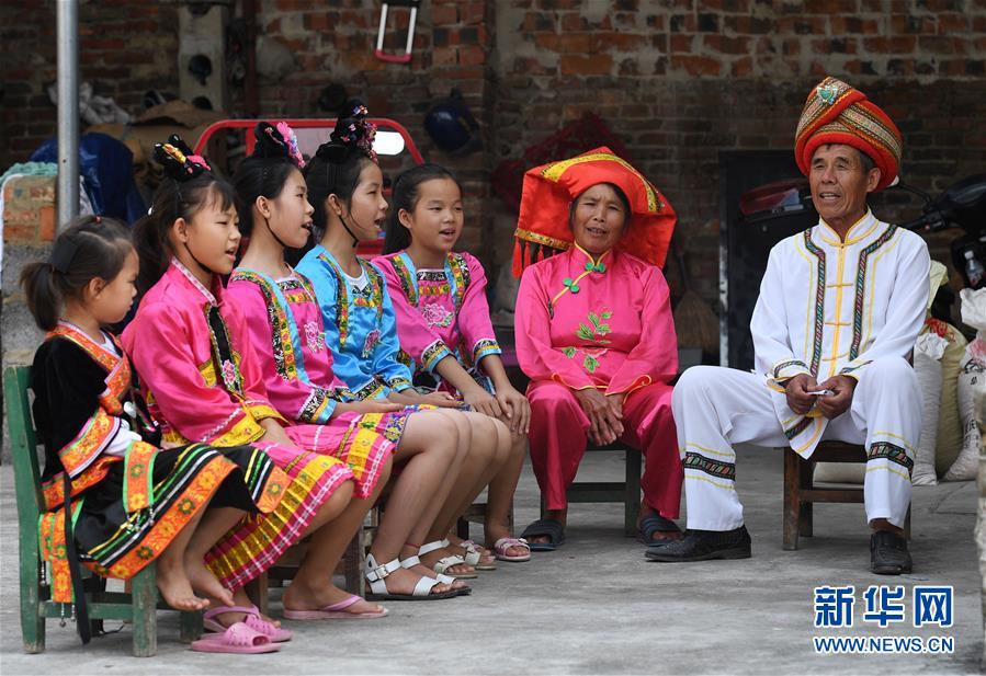 8月8日,在广西河池市宜州区庆远镇东屏村,谢庆良(右一)和爱人黄淑芝(右二)一起教村里的小孩子唱山歌。 新华社记者陆波岸摄