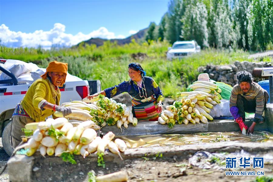 8月8日,村民在边雄乡萝卜种植基地田头的水池清洗萝卜。