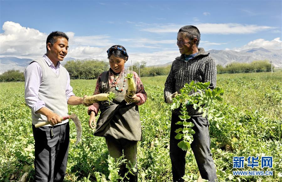 8月8日,在边雄乡普夏村萝卜种植基地,白玛梅朵合作社董事长加措(左)和收获萝卜的村民交流。 新华社记者 张汝锋 摄
