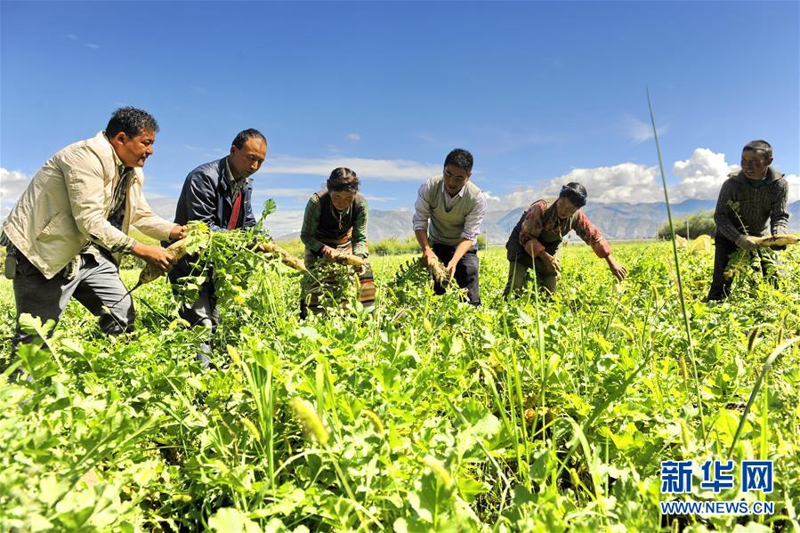 8月8日,在边雄乡普夏村萝卜种植基地,白玛梅朵合作社工作人员和当地群众一起收获萝卜。 新华社记者 张汝锋 摄