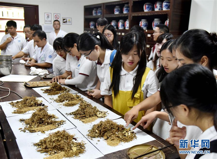 8月9日,香港大学生在浙江武义一中医馆识别中药材。 新华社发(张建成 摄)