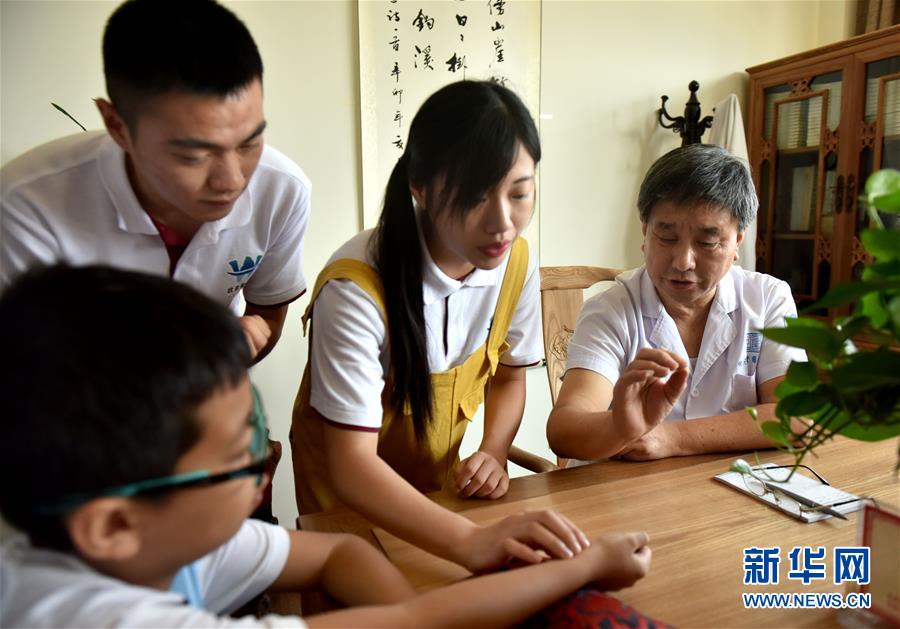 8月9日,香港大学生在浙江武义一中医馆体验传统把脉方式。 新华社发(张建成 摄)