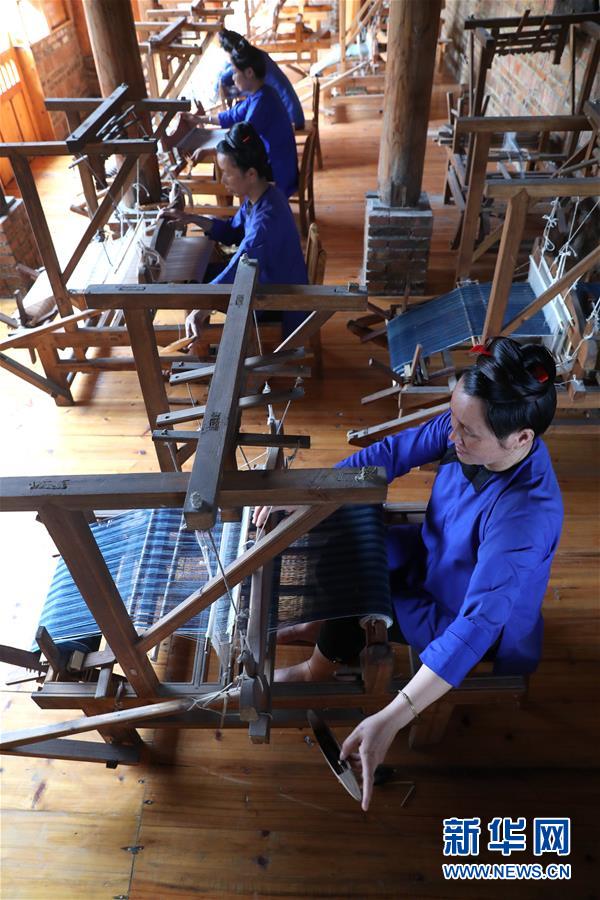 8月9日,在贵州省榕江县古州镇三宝侗寨,侗族织娘在贵州娘美布彩印染坊织布。 新华社发(杨成利 摄)