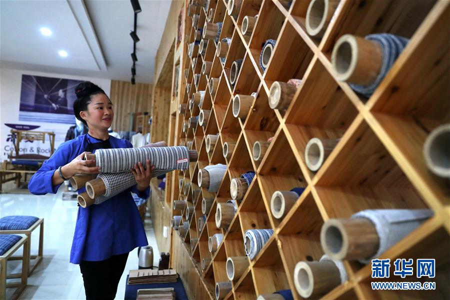 8月9日,在贵州省榕江县古州镇三宝侗寨,杨玲在整理产品。 新华社发(杨成利 摄)