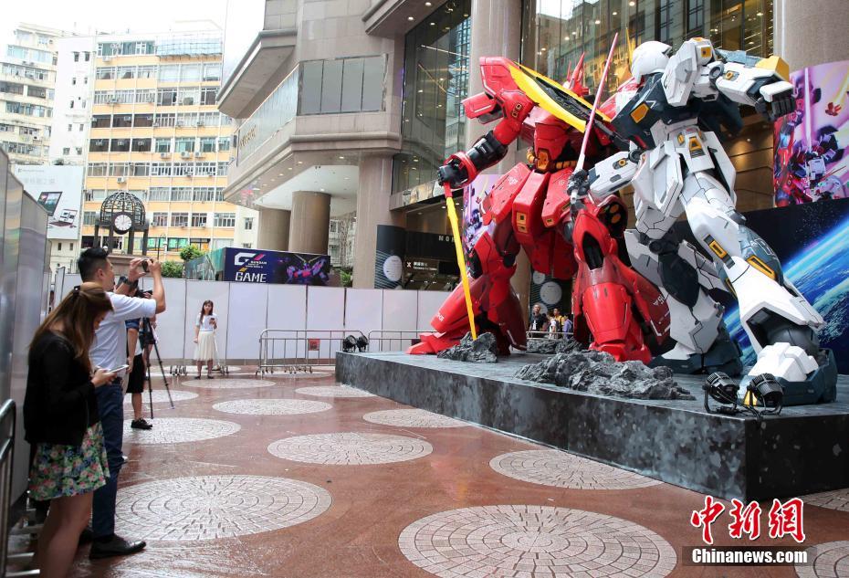 8月10日,动画新作《高达创战潜行者》的专区亮相闹市。今年适逢是机动战士高达剧场版《马沙的反击》上映30周年,香港时代广场于8月11日至9月2日期间,再度展开以高达为主题的展览“GUNDAM DOCKS AT HONG KONG III”。场地内更设有动画新作《高达创战潜行者》的专区,以及 PS4 平台上的高达最新游戏《New GUNDAM BREAKER》的试玩专区,无论是什么年龄层的高达迷,都能够从中充分感受《高达》系列的气氛。图为现场展出6米高的RX-93 Nu高达及MSN-04沙煞比之间的激战场景。 中新社记者 洪少葵 摄