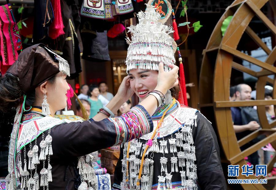 8月10日,在豫园展演活动现场,演员在整理服饰。 新华社记者刘颖摄