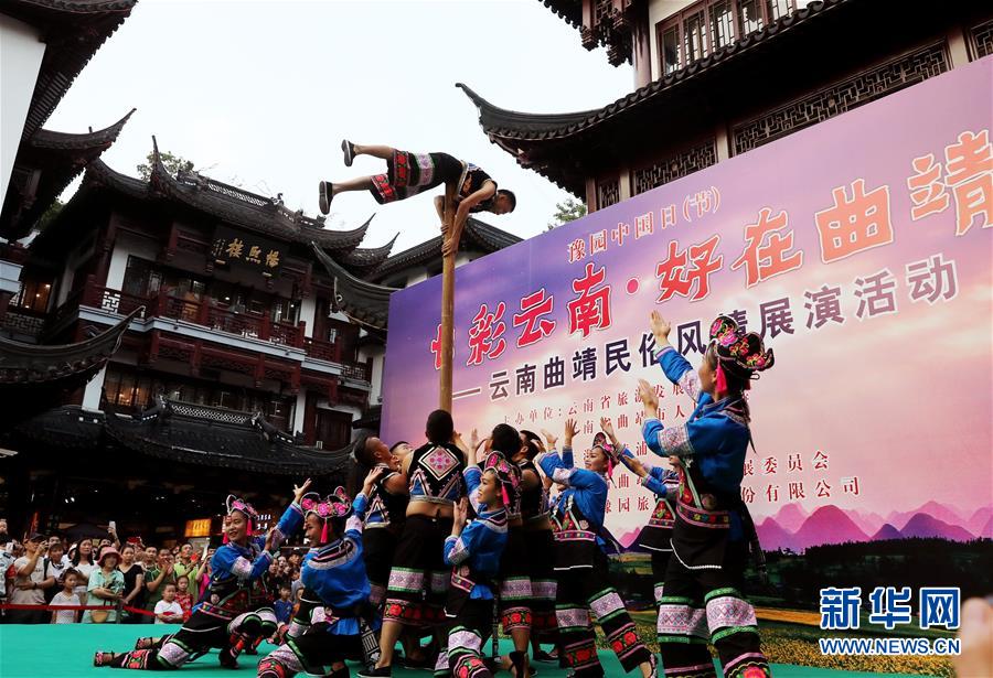 8月10日,彝族舞蹈《磨秋情》在豫园展演现场上演。 新华社记者刘颖摄