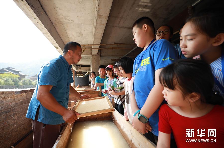 8月14日,在贵州省黔东南苗族侗族自治州丹寨县南皋乡石桥村“纸会唱歌”古法造纸研学基地,潘玉华向学生演示“抄纸”。 今年43岁的潘玉华是国家级非物质文化遗产“皮纸制作技艺”的传承人,从小就跟着爷爷学习这项古老的造纸技艺,2006年,为了实现爷爷造纸技艺传承的遗愿,一直在外工作的他回到故乡丹寨县南皋乡石桥村重操纸业。2013年,他创建了名为“纸会唱歌”的古法造纸研学体验基地,并将原先繁琐的造纸流程简化成浇纸浆、摆花、压榨脱水、烘干等几道主要工序,让游客通过不到30分钟的过程便可亲身体验这种古老的技艺,从而加深对古法造纸的认知和对中国传统纸文化的喜爱,变销售“纸产品”为销售“纸文化”。 如今,潘玉华的研学基地每年接待游客8000多人次,同时带动了石桥村100多名村民实现家门口就业。 潘玉华说,创新古法造纸体验方式不仅能提高收入,更是为古法造纸引入新思维、注入新动力,促进传统技艺得到更好地传承,让古老的造纸技艺“唱起新歌”。 新华社发(黄晓海 摄)