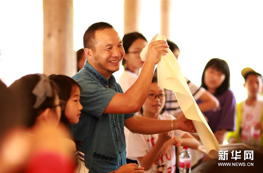 8月14日,在贵州省黔东南苗族侗族自治州丹寨县南皋乡石桥村“纸会唱歌”古法造纸研学基地,潘玉华向学生讲解古法造纸的历史。 今年43岁的潘玉华是国家级非物质文化遗产“皮纸制作技艺”的传承人,从小就跟着爷爷学习这项古老的造纸技艺,2006年,为了实现爷爷造纸技艺传承的遗愿,一直在外工作的他回到故乡丹寨县南皋乡石桥村重操纸业。2013年,他创建了名为“纸会唱歌”的古法造纸研学体验基地,并将原先繁琐的造纸流程简化成浇纸浆、摆花、压榨脱水、烘干等几道主要工序,让游客通过不到30分钟的过程便可亲身体验这种古老的技艺,从而加深对古法造纸的认知和对中国传统纸文化的喜爱,变销售“纸产品”为销售“纸文化”。 如今,潘玉华的研学基地每年接待游客8000多人次,同时带动了石桥村100多名村民实现家门口就业。 潘玉华说,创新古法造纸体验方式不仅能提高收入,更是为古法造纸引入新思维、注入新动力,促进传统技艺得到更好地传承,让古老的造纸技艺“唱起新歌”。 新华社发(黄晓海 摄)