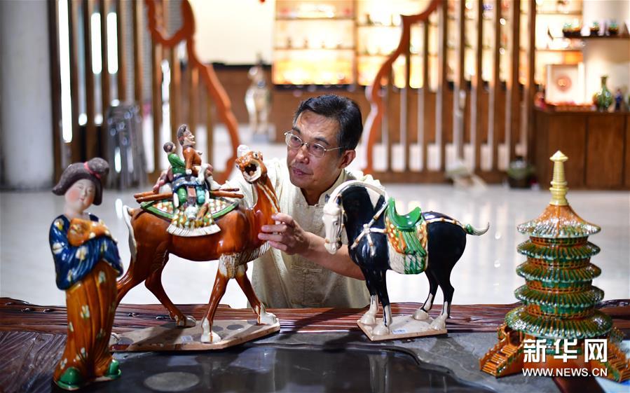 8月15日,在河南省洛阳市孟津县朝阳镇,唐三彩烧制技艺代表性传承人高水旺在研究唐三彩作品。 位于河南省洛阳市孟津县朝阳镇的南石山村因生产唐三彩而闻名中外。20世纪70年代以来,以村民高水旺为代表的艺人钻研出唐三彩制作的仿古工艺和新工艺,全村目前有唐三彩生产企业70余家,年生产各类唐三彩工艺品近百万件。 2008年,唐三彩烧制技艺经国务院批准列入第二批国家级非物质文化遗产名录。2009年,高水旺被命名为唐三彩烧制技艺代表性传承人。 新华社记者冯大鹏摄