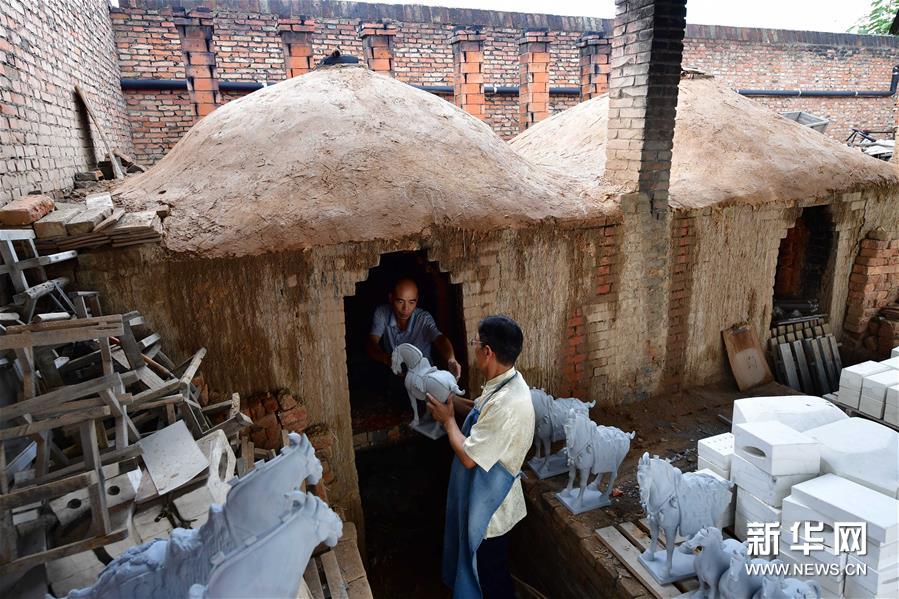 8月15日,在河南省洛阳市孟津县朝阳镇,唐三彩烧制技艺代表性传承人高水旺(右)在装窑,准备素烧。 位于河南省洛阳市孟津县朝阳镇的南石山村因生产唐三彩而闻名中外。20世纪70年代以来,以村民高水旺为代表的艺人钻研出唐三彩制作的仿古工艺和新工艺,全村目前有唐三彩生产企业70余家,年生产各类唐三彩工艺品近百万件。 2008年,唐三彩烧制技艺经国务院批准列入第二批国家级非物质文化遗产名录。2009年,高水旺被命名为唐三彩烧制技艺代表性传承人。 新华社记者冯大鹏摄