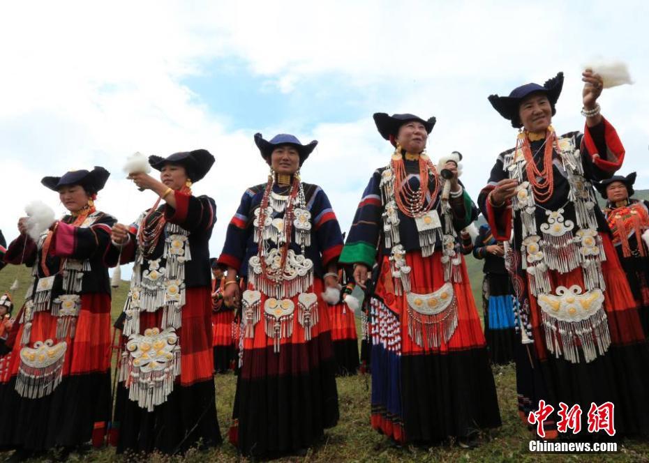 彝族老妈妈捻羊毛线。 萨古曲惹 摄