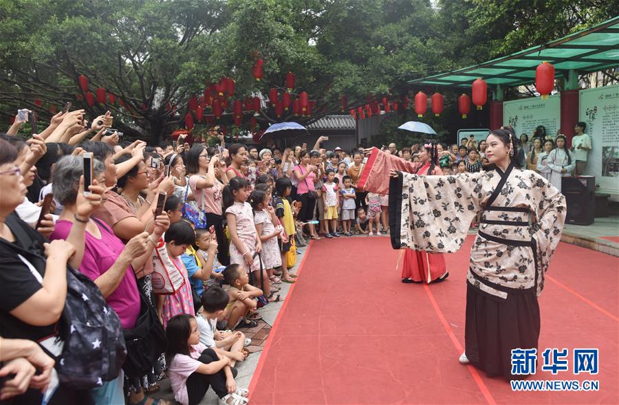 8月17日,在广州举行的七夕乞巧游园活动上,市民在观看汉服展演。