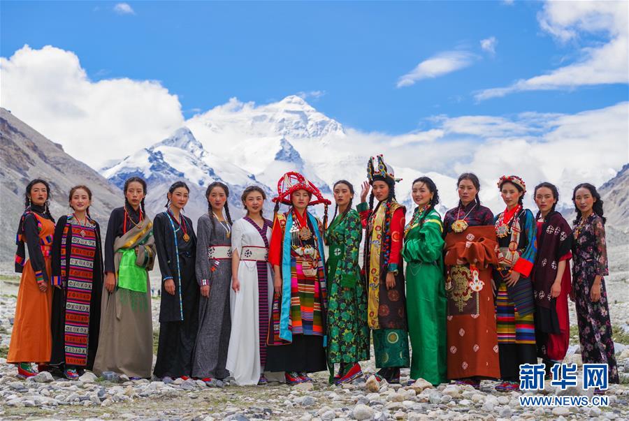 8月18日,模特在西藏民族服饰珠峰秀上展示时装。 当日,“格桑花开”西藏民族服饰珠峰秀在海拔5200米的珠峰大本营举行。14名来自西藏各地的模特身着融合藏文化元素的时装,为游客带来一场视觉盛宴,拉开了2018珠峰文化旅游节的序幕。 新华社发(倪旸 摄)