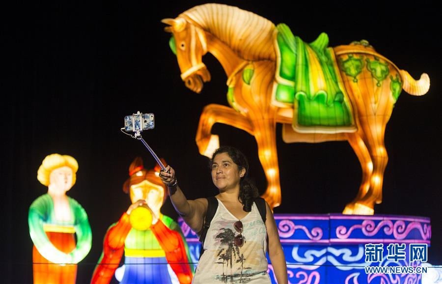 8月18日,在加拿大多伦多,一名观众在展览会的灯展上自拍。 2018加拿大国家展览会于8月17日至9月3日在多伦多举行。本届展览会推出以“丝绸之路”为主题的中国灯展,通过17组由中国四川自贡90位匠人制作的大型彩灯,向人们介绍古代“丝绸之路”的神话传说和文化风情。 新华社发(邹峥摄)