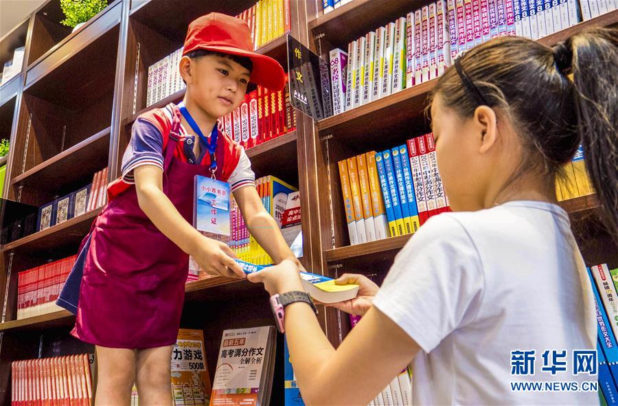 8月20日,“小小荐书员”在河北省武邑县新华书店向顾客推介图书。 近日,河北省武邑县新华书店开展为期十天的“小小荐书员”暑期社会实践活动。孩子们在书店协助营业员进行图书整理、荐售等工作,工作之余孩子们还可以阅读自己喜欢的读物,丰富暑期生活。 新华社记者李晓果摄