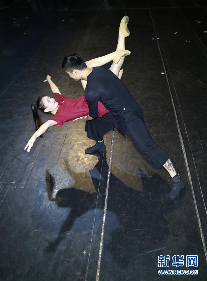 8月22日,黄超(右)和王惠在剧场排练。 新华社发(吴勇兵 摄)