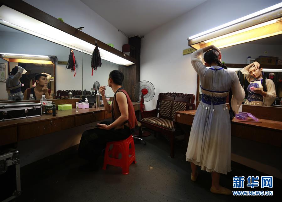 8月22日,黄超(左)和王惠在登台演出前化妆。 新华社发(吴勇兵 摄)