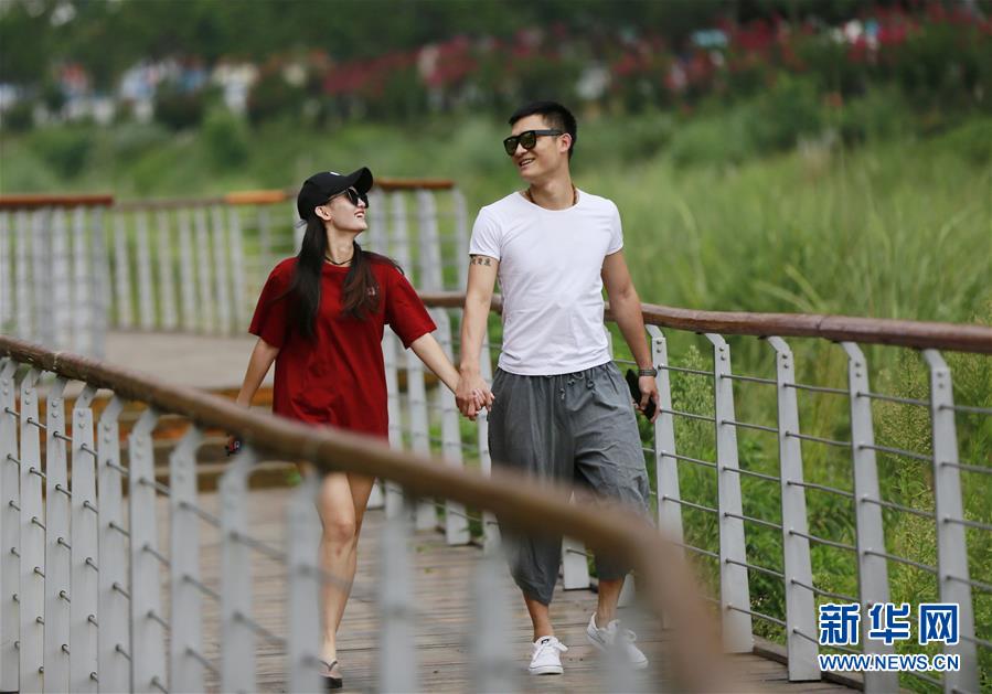 8月22日,黄超(右)和王惠在张家界武陵源城区索溪河畔散步。 新华社发(吴勇兵 摄)