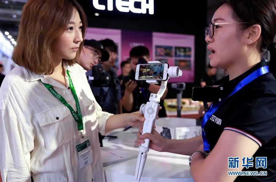 8月22日,观众(左)在展会现场了解新型手机云台的功能。 当日,第27届北京国际广播电影电视展览会在北京中国国际展览中心拉开帷幕,世界各地520余家广播影视生产厂家和运营机构参展。 新华社记者 潘旭 摄