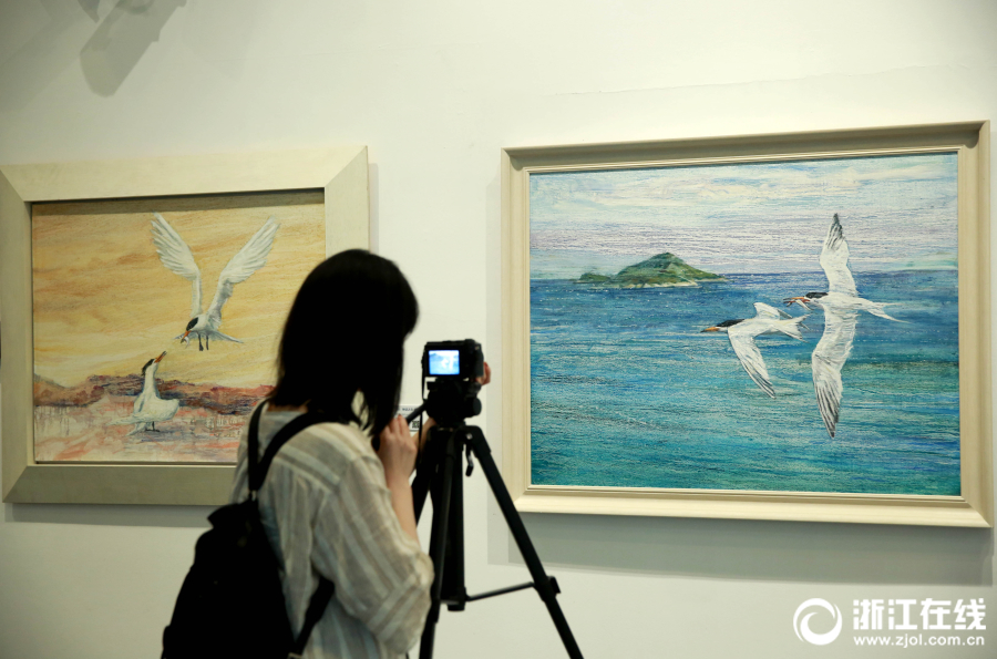 8月22日,“顺其自然-陈子胄生态绘画艺术展”在浙江自然博物馆开展。展览展出了陈子胄先生60余件油画、国画作品,展示了自然界中各类动植物的千姿百态,尤其是中华凤头燕鸥,它是中国最珍稀的鸟类,因其稀少神秘,被学者专家称为“神话之鸟”。(浙江在线记者 魏志阳 摄)