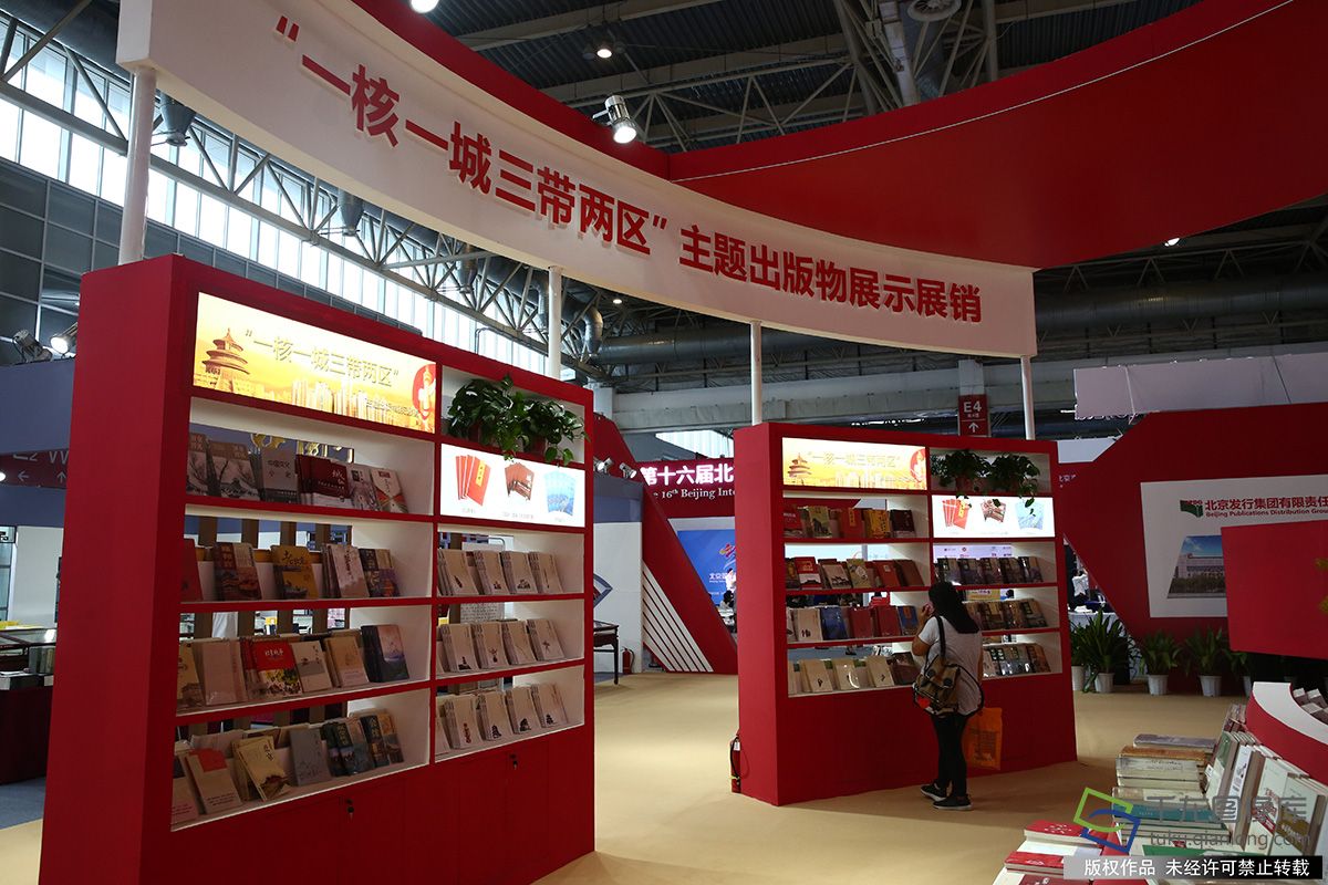 8月22日,北京国际图书节主展馆展出的“一核一城三带两区”主题出版物(图片来源:tuku.qianlong.com)。千龙网记者 万小军摄