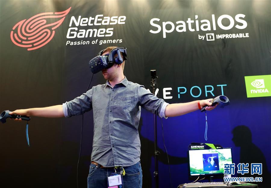 8月22日,在德国科隆,一名男子在网易展位体验虚拟现实游戏。 作为全球主要的互动游戏和娱乐展会,第10届科隆国际游戏展21日在德国科隆国际展览中心拉开帷幕。腾讯、网易、游族等多家中国参展商参加了本届展会。 新华社记者罗欢欢摄