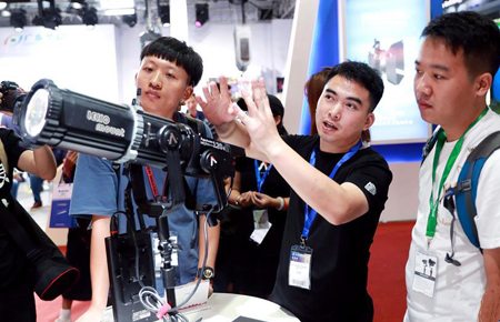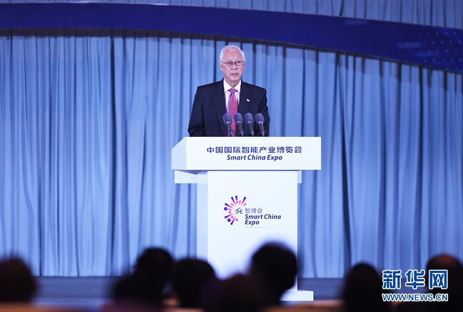 8月23日,首届中国国际智能产业博览会在重庆开幕。这是新加坡荣誉国务资政吴作栋在开幕式上致辞。 新华社记者 王全超 摄