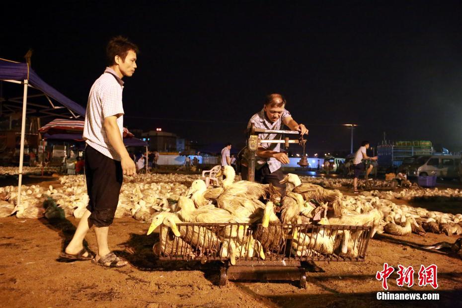 8月23日晚至24日凌晨,商贩给鸭子称重。 朱柳融 摄