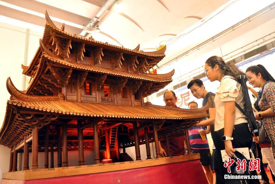 8月24日,2018广西工艺美术作品旅游工艺品暨大师精品展览在南宁举行。展览上,由广西玉林市容县十里镇江口村农民覃世坤用近3000条格木构件制作的微缩版“真武阁”亮相,吸引参观者。据悉,覃世坤花费了一年半时间纯手工制作的真武阁模型为杠杆式格木结构,全部按照真武阁原件1:10的比例制作。中新社记者 黄艳梅 摄