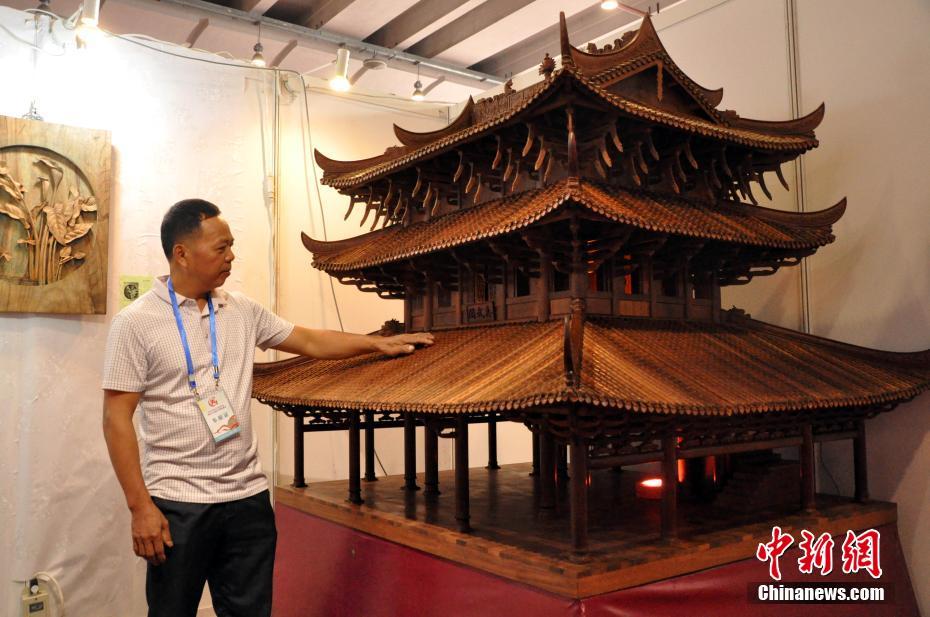 8月24日,2018广西工艺美术作品旅游工艺品暨大师精品展览在南宁举行。展览上,由广西玉林市容县十里镇江口村农民覃世坤用近3000条格木构件制作的微缩版“真武阁”亮相,吸引参观者。据悉,覃世坤花费了一年半时间纯手工制作的真武阁模型为杠杆式格木结构,全部按照真武阁原件1:10的比例制作。中新社记者 黄艳梅 摄