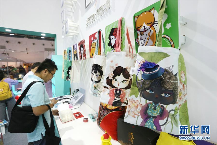 8月24日,观众在展厅内欣赏创意手绘帆布包。 新华社发