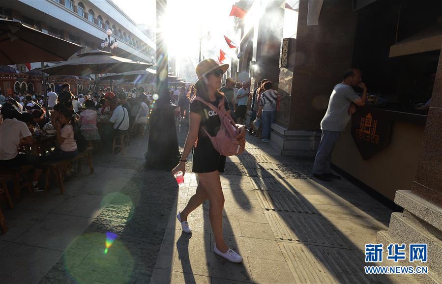 游客在乌鲁木齐二道桥大巴扎步行街美食街区游览(8月20日摄)。