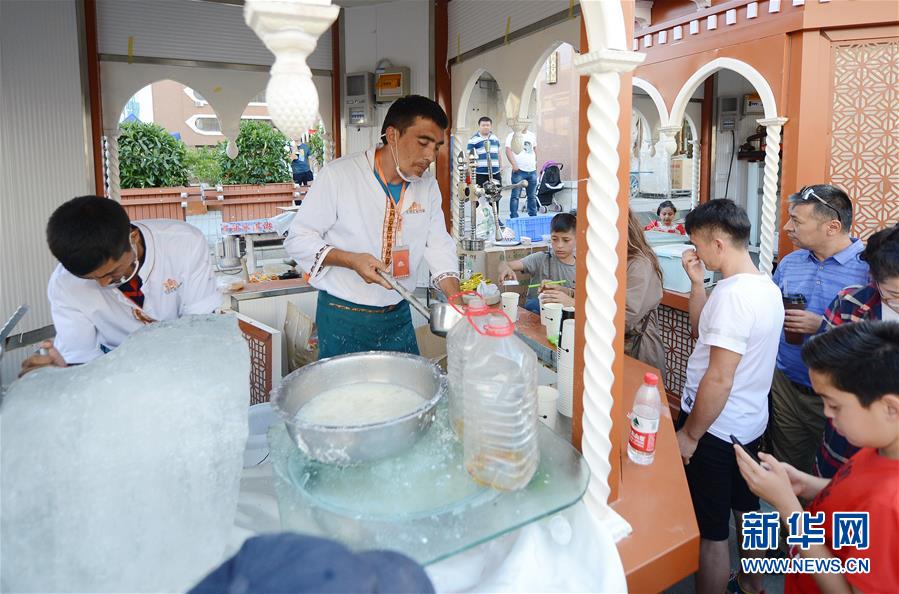 乌鲁木齐二道桥大巴扎步行街的商贩在制作冷饮(8月18日摄)。