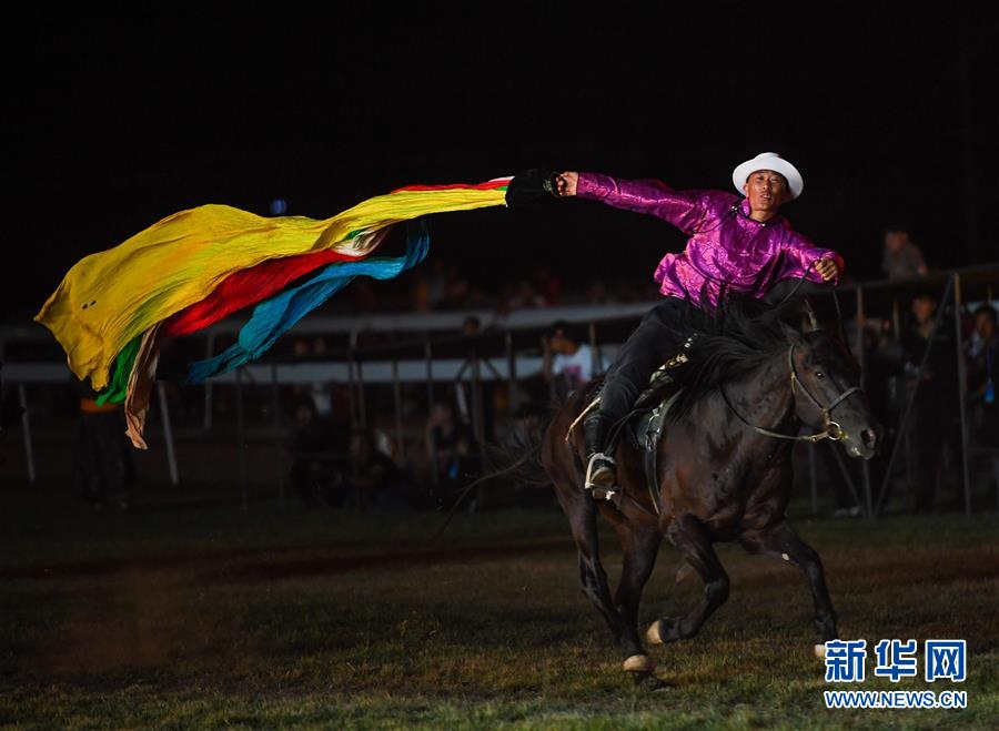 8月27日,在开幕式晚会上,民族马术表演者展示跑马捡哈达。 当日,中国·呼和塔拉蒙古马文化艺术周在内蒙古呼和浩特拉开帷幕。此次艺术周包括开幕式晚会、惠民文艺演出、啤酒美食节、马术赛马表演等主题活动。 新华社记者 彭源摄