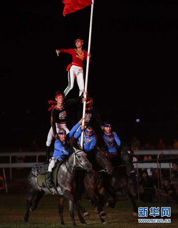 8月27日,在开幕式晚会上,民族马术表演者展示跑马叠罗汉。 当日,中国·呼和塔拉蒙古马文化艺术周在内蒙古呼和浩特拉开帷幕。此次艺术周包括开幕式晚会、惠民文艺演出、啤酒美食节、马术赛马表演等主题活动。 新华社记者 彭源摄