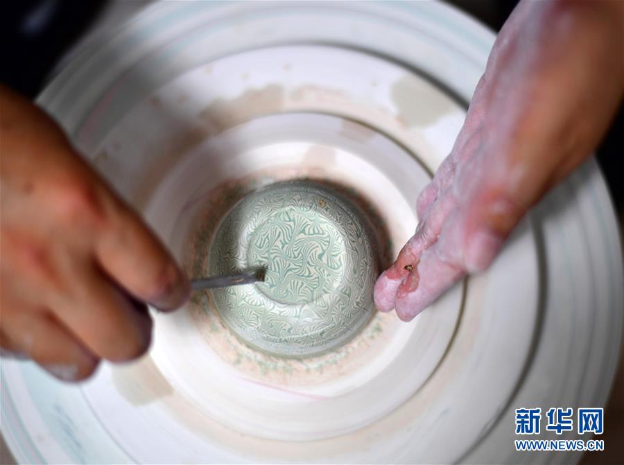 在河南省焦作市修武县当阳峪村,“当阳峪绞胎瓷烧制技艺”国家级代表性传承人柴战柱在修坯(8月27日摄)。 新华社记者 冯大鹏 摄