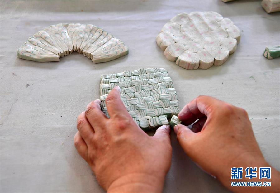 在河南省焦作市修武县当阳峪村,“当阳峪绞胎瓷烧制技艺”国家级代表性传承人柴战柱采用绞胎技法,将不同花色的泥块重组在一起(8月27日摄)。 新华社记者 冯大鹏 摄