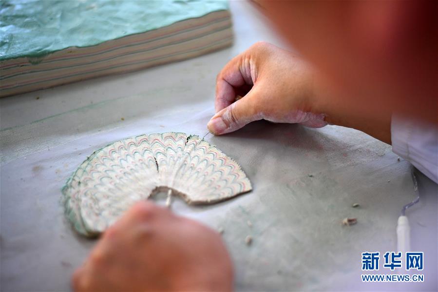 在河南省焦作市修武县当阳峪村,“当阳峪绞胎瓷烧制技艺”国家级代表性传承人柴战柱在“编织”绞胎瓷的羽毛纹图案(8月27日摄)。 新华社记者 冯大鹏 摄