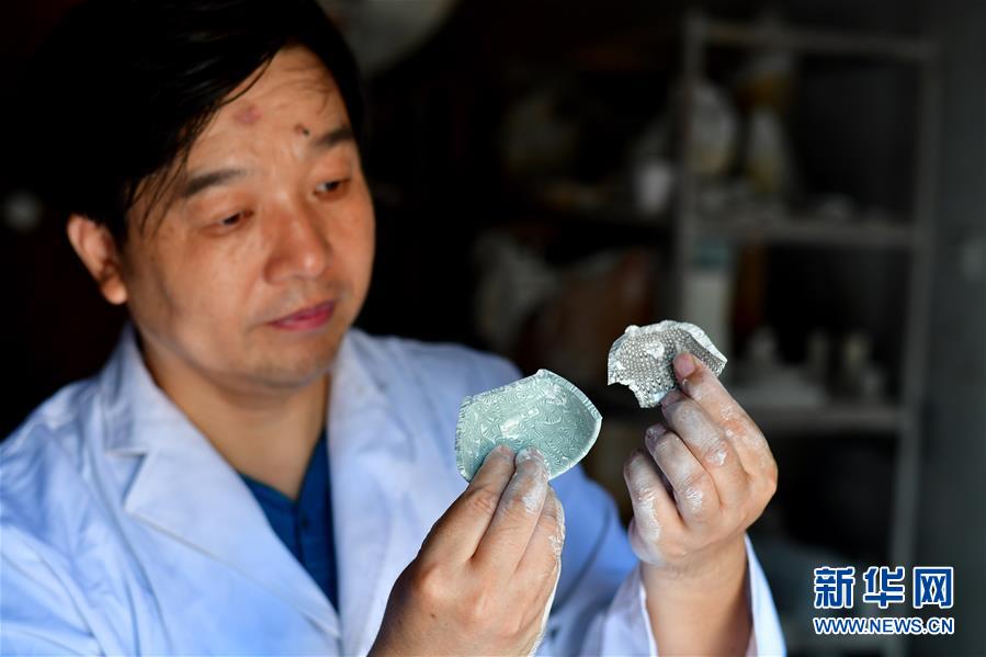 在河南省焦作市修武县当阳峪村,“当阳峪绞胎瓷烧制技艺”国家级代表性传承人柴战柱在查看绞胎瓷瓷片的纹路(8月27日摄)。 新华社记者 冯大鹏 摄