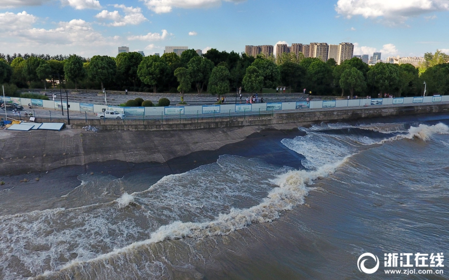 8月28日,农历七月十八,钱塘江杭州下沙七格堤坝,汹涌的钱塘江潮水汹涌而来。每年农历七月十八,为农历7月望汛大潮,俗称“鬼王潮”,常常胜过八月望汛大潮。(浙江在线记者 吴煌 倪雁强 刘方 摄)