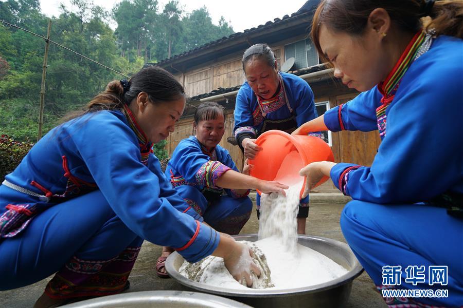 8月29日,在广西龙胜各族自治县马堤乡张家塘苗寨,苗族群众在制作传统酒曲。 新华社发(黄勇丹 摄)