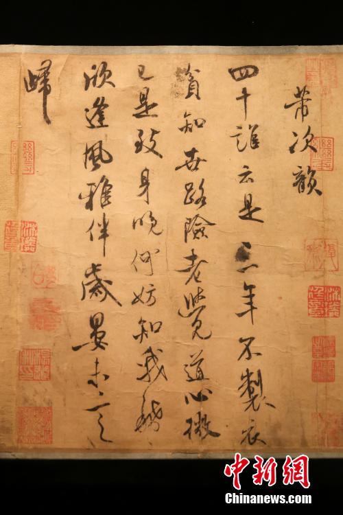 8月30日,中国宋代文学家苏轼的传世真迹《木石图》在香港佳士得亮相。画作裱成手卷,其后有题跋四首,包括同代著名画家兼书法大师米芾。苏轼与米芾均名列宋代四大书法名家。图为米芾题跋。中新社记者 谢光磊 摄