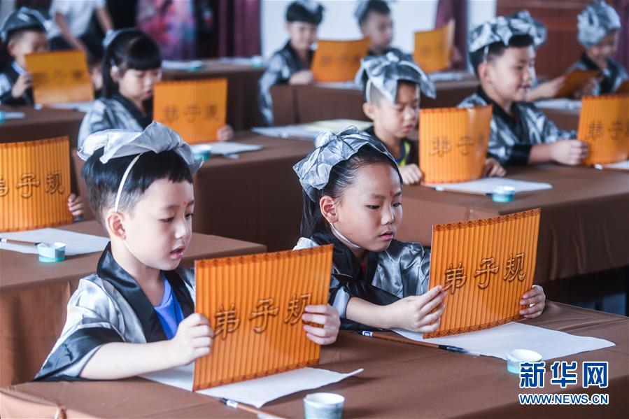8月30日,孩子们在文化礼堂内诵读弟子规。 当日,浙江省湖州市东林镇泉心村文化礼堂举办“传承经典 明礼感恩”开蒙礼活动,吸引当地30多名小朋友参与。 新华社记者 徐昱摄