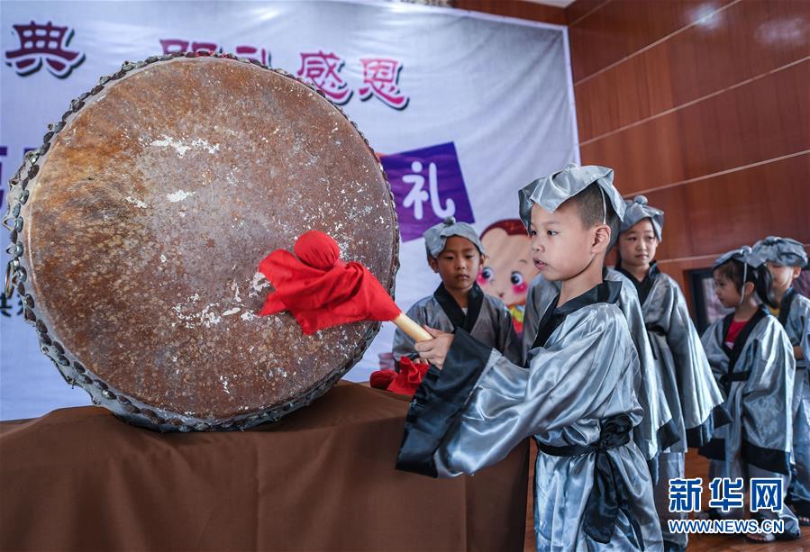 8月30日,孩子们在文化礼堂内参加开蒙礼活动中的“击鼓明志”环节。 当日,浙江省湖州市东林镇泉心村文化礼堂举办“传承经典 明礼感恩”开蒙礼活动,吸引当地30多名小朋友参与。 新华社记者 徐昱摄
