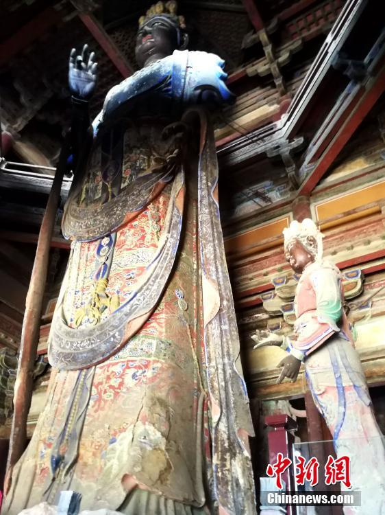 8月31日,中新社记者探访千年古刹独乐寺。独乐寺,又称大佛寺,位于中国天津市蓟州区,是中国仅存的三大辽代寺院之一,也是中国现存著名的古代建筑之一。图为独乐寺观音阁内的观音菩萨像是中国仅存的最大的古代泥塑之一。中新社记者 张道正 摄