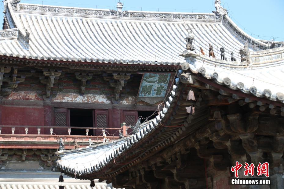 8月31日,中新社记者探访千年古刹独乐寺。独乐寺,又称大佛寺,位于中国天津市蓟州区,是中国仅存的三大辽代寺院之一,也是中国现存著名的古代建筑之一。图为独乐寺山门正脊的鸱尾,长长的尾巴翘转向内,犹如雉鸟飞翔,是中国现存古建筑中年代最早的鸱尾实物。中新社记者 张道正 摄